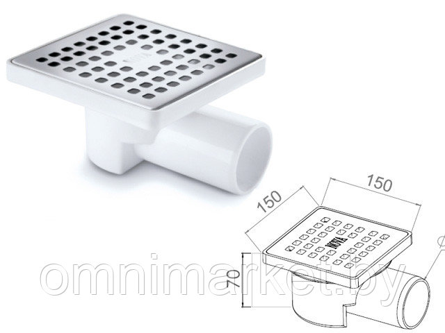 Сливной трап горизонтальный D 50, с сухим затвором, решетка нерж. 150х150 мм, NOVA