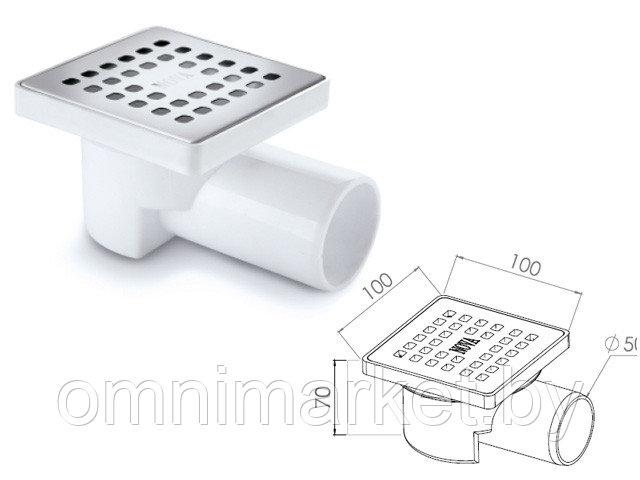 Сливной трап горизонтальный D 50, с сухим затвором, решетка нерж. 100х100 мм, NOVA
