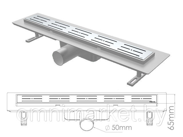 Сливной трап горизонтальный D 50, решетка нерж. с площадкой под плитку, 65х900мм полоски, NOVA